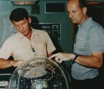 (21 Oct. 1965) --- Gemini-6 astronauts Walter M. Schirra Jr. (left), command pilot; and Thomas P. Stafford, pilot, look at a star globe for celestial pattern recognition for their upcoming flight. The National Aeronautics and Space Administration (NASA) plans a two-day mission for Gemini-6 for the astronauts to develop the ability to rendezvous and dock with an orbiting Agena Target Docking Vehicle.