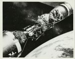 Meeting In Space: This artist's concept depicts the historic moment, scheduled for July 17, when an American astronaut and cosmonaut will greet one another as their Apollo and Soyuz spacecraft are docked together while orbiting the Earth 225 kilometers (140 miles) out in space. The joint Apollo Soyuz Test Project mission will mark the first time that manned spacecraft of two nations have met in space for joint engineering and scientific investigations.