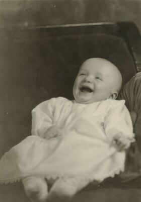 This was taken was I was just five months old, but my Mama has been slow in sending out to you. Guess I'm to blame for it though. I keep her pretty busy. I'm now six months old, weigh 18 lbs, can sit up, have five teeth & can say Mommy when I want to. I'd like to crawl but Mother & Dady won't let me on the floor yet. They're afraid I'll catch cold.