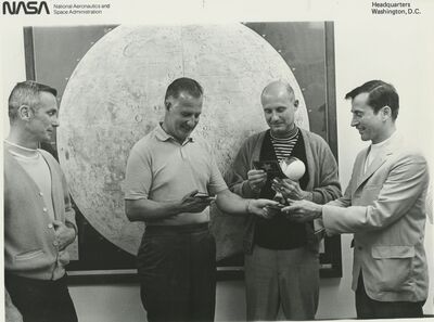 Caption: “KENNEDY SPACE CENTER, FLA – Vice President Spiro Agnew laughs with Apollo 10 astronauts after receiving “Snoopy” mascot during visit today to their crew quarters at the Kennedy Space Center. Sharing the joke with the Vice President are Apollo 10 space pilots, left-to-right, Eugene A. Cernan, Thomas P. Stafford, and John W. Young, a day before their planned lunar orbit flight. The National Aeronautics and Space Administration directs the Apollo program.”