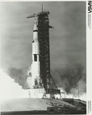 Caption: “KENNEDY SPACE CENTER, FLA. – An Apollo/Saturn V space vehicle carrying Apollo 10 astronauts Thomas P. Stafford, John W. Young, and Eugene A. Cernan lifted off at 12:49 p.m., DST, May 18, 1969, from the Kennedy Space Center’s Launch Complex 39B. The 363-foot-high vehicle launched the astronauts on the first leg of their 73-hour, 240,000-mile-journey to the moon. Apollo 10 is a dress rehearsal for the first lunar touchdown. During Apollo 10, Stafford and Cernan will descend in a lunar module spacecraft to within eight nautical miles of the Moon’s surface while Young pilots the command module at an altitude of 60 nautical miles. Following an eight-and-a-half-hour exercise, Stafford and Cernan will rendezvous and dock their lunar module with the command module and return to the mother ship for the remainder of their 60 hours or 30 revolutions in lunar orbit. The astronauts will conduct lunar navigation tasks and will photograph Apollo landing sites in order to provide information for the succeeding landing mission. Several color television transmissions are planned during the National Aeronautics and Space Administration’s eight-day mission. (The Saturn V generates a liftoff thrust of 7.7 million pounds).”