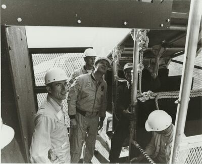 Caption: “KENNEDY SPACE CENTER, FLA. – The National Aeronautics and Space Administration’s Apollo 10 mission flight crew are shown participating in emergency egress procedures tests at Launch Complex 39A. The Apollo 10 mission flight crew are Thomas A. Stafford, Commander, John W. Young, Command Module Pilot, and Eugene Cernan, Lunar Module Pilot. The Lunar Orbit Mission with a lunar module descent to within 50,000 feet of the Moon’s surface is scheduled no earlier than May 18.” The Apollo 10 mission flight crew are Thomas A. Stafford, Commander, John W. Young, Command Module Pilot. The Lunar Orbit Mission with a lunar module descent to within 50,000 feet of the Moon’s surface is scheduled no earlier than May 18.”