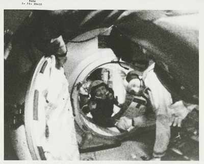ASTP ON-BOARD PHOTO – Astronaut Thomas P. Stafford (in foreground) and Cosmonaut Aleksey A. Leonov make their historic handshake in space on July 17, 1975 during the joint U.S. – USSR Apollo-Soyuz Test Project docking in Earth orbit mission. This picture was made from a frame of 16mm motion picture film.
