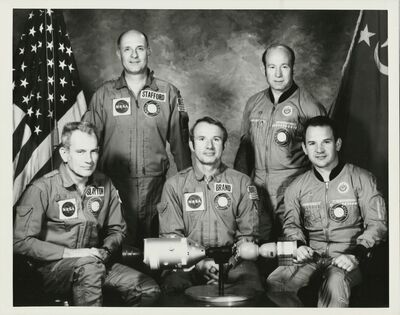 ASTP PRIME CREWS: The two prime crews of the joint U.S.-USSR Apollo Soyuz Test Project mission scheduled for this July include: standing, Astronaut Thomas P. Stafford, left, commander of the American crew; and Cosmonaut Aleksey A. Leonov, right, commander of the Soviet crew; and seated, left to right, Astronaut Donald K. Slayton, docking module pilot; Astronaut Vance D. Brand, command module pilot, both on the American crew; and Cosmonaut Valeriy Kubasov, engineer on the Soviet crew.