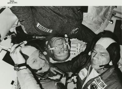 ASTP ON-BOARD PHOTO – Astronaut Donald K. Slayton, Cosmonaut Aleksey A. Leonov, and Astronaut Thomas P. Stafford are photographed in the Soviet Soyuz Orbital Module during the joint U.S.-USSR Apollo-Soyuz Test Project docking in Earth orbit mission. This picture was taken with a 35mm camera.