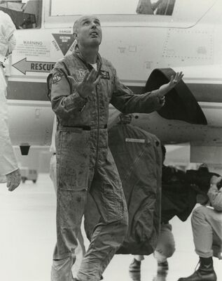 KENNEDY SPACE CENTER, FLA. – ASTP mission commander Thomas Stafford looks up at the rain pouring down after his arrival at Patrick Air Force base. Stafford was the first of the ASTP crew to arrive at KSC from Houston for the American portion of the ASTP launch scheduled for 3:50 p.m. on July 15.