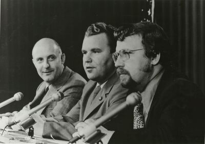 ASTP NEWS CONFERENCE – Cosmonaut Vladimir A. Shatalov (center), Chief of Cosmonaut Training for the USSR, answers questions at an Apollo-Soyuz Test Project press conference conducted on September 11, 1974 in building 2 at the Johnson Space Center. Astronaut Thomas P. Stafford (left), commander of the American ASTP crew, took part in the conference, also. Interpreter Anatole Forostenko is on the right. Shatalov accompanied a group of Soviet Cosmonauts to the U. S. for three weeks of joint crew training at JSC.