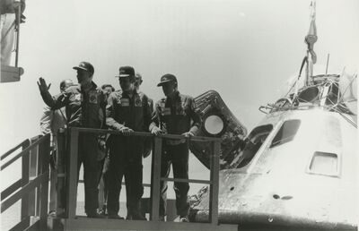 KENNEDY SPACE CENTER, FLA. – ASTP crewmen Thomas Stafford, Vance Brand, and Donald Slayton wave to crewmen of the USS New Orleans after emerging from their Apollo Command Module during recovery operations in the Pacific Ocean today. The crew splashed down at 5:18 p.m. and were hoisted aboard the New Orleans about 6 p.m., after which they participated in ceremonies on the ship’s deck. The splashdown ended the historic ASTP space mission, which was highlighted by the docking in Earth orbit with a Soviet Soyuz spacecraft.