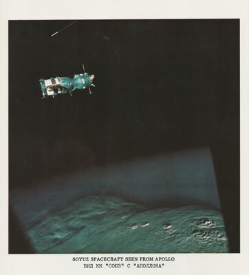SOYUZ AS SEEN FROM APOLLO – The Soviet Soyuz 19 is seen from the USA Apollo spacecraft at a range of approximately 35 meters during the first joint USA-USSR space mission, the Apollo-Soyuz Test Project. The Soyuz is against the black space background while heavy clouds cover the Earth below in the area of northeast South America. The three components of the Soyuz vehicle are the instrument assembly module (left), descent module (center), and the orbital module (right). The docking mechanism, compatible with a similar USA unit, protrudes to the right of the orbital module. One of the winglike solar panels, which provide electrical power, protrudes from the instrument assembly module. Other protrusions are the navigation periscope and antennas. Cosmonauts Aleksey A. Leonov and Valeriy N. Kubasov, returned to Earth July 21, 1975, in the bell-shaped descent vehicle with its circular window visible here.
