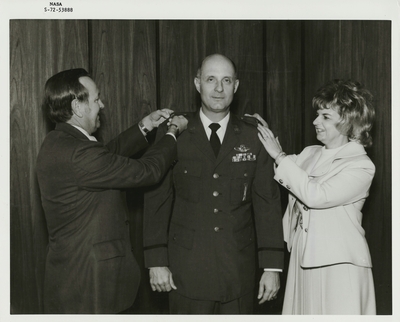 STAFFORD NOW GENERAL – Astronaut Thomas P. Stafford has been promoted from colonel to brigadier general in the U. S. Air Force. Pinning a star on the shoulders of the new one-star general during ceremonies at the Manned Spacecraft Center on November 29, 1972, are Dr. Christopher C. Kraft Jr., MSC Director, and the astronaut’s wife, Mrs. Faye Stafford. General Stafford, Deputy Director of Flight Crew Operations at MSC, flew on the Geminis 6 and 9 and Apollo 10 space missions.