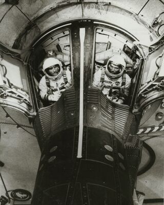 CAPE KENNEDY, FLA. – (L – R) Gemini VI astronauts Walter M. Schirra, Jr., command pilot and Thomas P. Stafford, pilot, checkout the spacecraft during a wet mock simulation test at Complex 19 in preparation for the National Aeronautics and Space Administration’s Gemini VI rendezvous and docking mission.