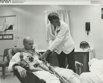 Cape Kennedy, Fla. – Astronaut Thomas P. Stafford, pilot of the Gemini VI space flight undergoes suiting up operations in the Launch Complex 19 trailer during the Gemini VI prelaunch countdown. Stan Beneck, a NASA Bioinstrumentation technician checks Stafford’s blood pressure, while a suit technician adjusts the astronaut’s boot. The National Aeronautics and Space Administration successfully launched Gemini VI from Pad 19 at 8:37 a.m. (EST) today, December 15, 1965. A two-day mission in space is scheduled for astronauts Stafford and Walter M. Schirra, Jr., Command Pilot. An attempt will be made to rendezvous with Gemini VI with Gemini VII.