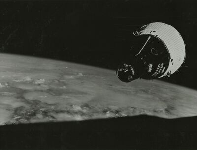ON BOARD THE GEMINI VII SPACECRAFT – Gemini 7/6 Space Photography – This photograph of the National Aeronautics and Space Administration’s Gemini VII spacecraft was taken through the hatch window of the Gemini VI spacecraft during rendezvous and station keeping maneuvers at an altitude of approximately 160 miles on December 16, 1965. The photograph was taken with a Hasselblad camera using Kodak S.O. 217 film with an ASA of 64.