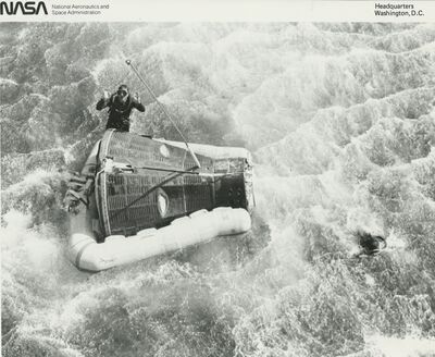CAPE KENNEDY, FLA. – A Helicopter hovers over the National Aeronautics and Space Administration’s Gemini 6 spacecraft just after it splashed down 12 miles from the aircraft carrier U.S.S. Wasp in the western Atlantic recovery area at 10:29 a.m., (EST) today, December 16, 1965. A three-man U.S. Navy frogman team and survival gear were dropped into the water to aid in the recovery operations. Astronauts Walter M. Schirra, Jr., and Thomas P. Stafford remained inside the spacecraft until it was hoisted aboard the carrier. Gemini 6 was a highly successful 25 hr. 52 min. mission in space.