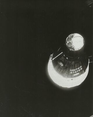ON BOARD THE GEMINI VII SPACECRAFT – This view of the National Aeronautics and Space Administration’s Gemini VI spacecraft, with a “Beat Army” sign in the pilot’s hatch window, was taken from the Gemini VII spacecraft during rendezvous of the two on December 15, 1965. The photograph was taken with a 70mm Hasselblad camera using Kodak S.O. 217 MS film. Crew members on the Gemini VII spacecraft are Astronaut Frank Borman, command pilot, and Astronaut James A. Lovell Jr., pilot. Crew members on board the Gemini VI are Astronauts Walter M. Shirra Jr., command pilot, and Thomas P. Stafford, pilot.