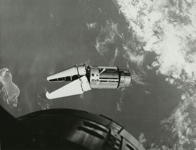 ANGRY ALLIGATOR – View of the Augmented Target Docking Adapter with fiber glass cover still attached as seen from the orbiting National Aeronautics and Space Administration’s Gemini IX spacecraft. North is in lower left corner of picture. Island at left is Los Roquez. Carib Sea is directly below the ATDA. Caracas, Venezuela is at right, below cloud cover.