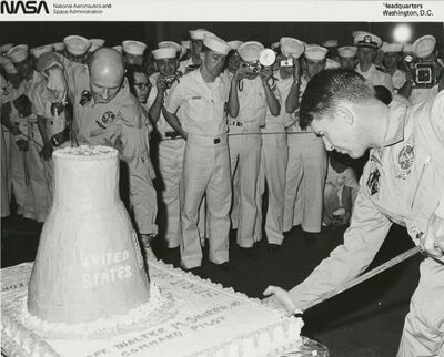 CAPE KENNEDY, FLA. – Astronauts Walter M. Schirra, Jr., (right), command pilot, and Thomas P. Stafford, pilot, slice into a huge cake which was part of their warm welcome after arriving aboard the aircraft carrier U.S.S. Wasp. The National Aeronautics and Space Administration’s Gemini 6 spacecraft splashed down 12 miles from the carrier in the western Atlantic recovery area at 10:29 a.m., (EST) today, December 16, 1965, after a highly successful 25 hour 52 minutes mission in space. Sailors gather around close to watch the cake cutting.