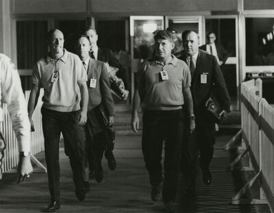 CAPE KENNEDY, FLA. – Astronauts Thomas P. Stafford (left), pilot, and Walter M. Schirra, Jr., command pilot, leave the Manned Spacecraft Operations Building, Merritt Island, on their way to the suiting trailer at launch complex 16. Behind Stafford are Astronaut Alan B. Shepard, Jr., and Dr. A. D. Catterson, Astronaut Physician. Charles Buckley, Security Officer, follows behind Schirra. The National Aeronautics and Space Administration has planned Gemini VI as a two-day mission in space. An attempt was made to launch Gemini VI at 9:54 a.m. (EST) today. However, seconds after ignition, the first stage engine of the Gemini Launch Vehicle VI shut down due to a faulty release of a liftoff umbilical plug.