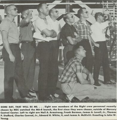 SOME DAY, THAT WILL BE ME… Eight new members of the flight crew personnel recently chosen by MSC watched the MA-8 launch, the first since they were chosen, outside of Mercury Control Center. Left to right are Neil A. Armstrong, Frank Borman, James A. Lovell, Jr., Thomas P. Stafford, Charles Conrad Jr., Edward H. White, II, and James A. McDivitt. Kneeling is John W. Young.