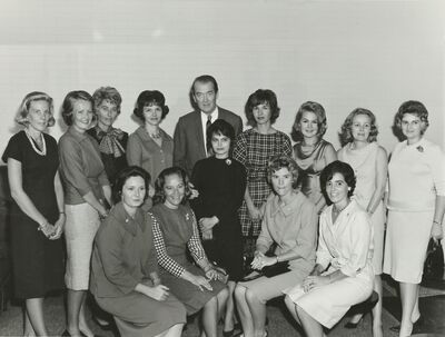 Standing: Jo Schirra, Sue Borman, Mrs. Stewart, Marilyn Lovell, James Stewart, Harriet Eisle, Jane Conrad, Sandra Dee, Pat White, and Faye Stafford.