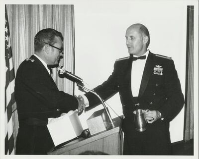 Col Woods presents Col Stafford a momento of appreciation, JOC Dining In, Vance AFB, 10 Mar 72.