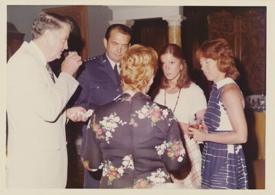 Apollo-Soyuz crew at State Dept. reception after flying to Washington to meet with President Ford.