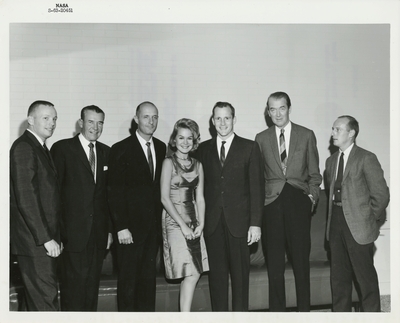 Neil Armstrong, Raymond Willie (Interstate Theaters), Thomas Stafford, Sandra Dee, Edward H. White, James Stewart, and Charles Conrad pose before the camera.