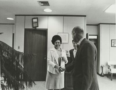 Col. Stafford is greeted by Mrs. Alberta Moran of the Director's Office.