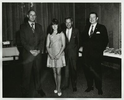 Col. Stafford poses for a picture with Miss Frances Shryock, Goddard Queen. Turner N. Wiley, Head, Comm. Engr. Branch and Chairman, MFSD/Manned Flight Awareness Council. Dr. John F. Clark, Director of GSFC, prior to the luncheon held before the Snoopy Awards Ceremony.