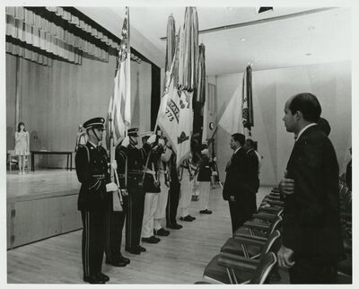 The Joint Service Color Team under the leadership of Sergeant Florentino Sterling stands at attention as the U.S. Army Band plays the National Anthem to begin the Snoopy Awards Ceremony.