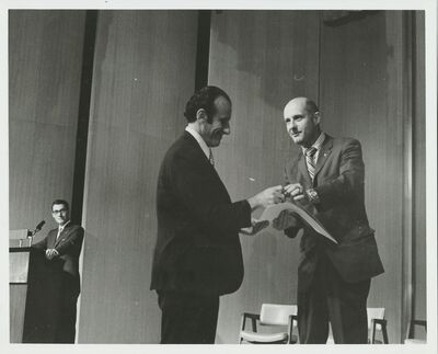 Ben Goldman of GSFC Procurement Division accepts a Silver Snoopy Pin and Certificate from Col. Stafford.