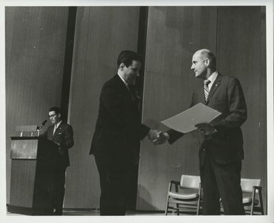 Charles H. Bird of the Univac Division of Sperry Rand accepts congratulations from Co. Stafford following the award of the Silver Snoopy Pin.