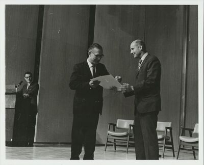 Samuel J. Badger of GSFC Procurement Division receives a Snoopy Pin and Certificate from Col. Stafford.