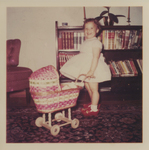 Caption: "Taken on her birthday, with her wooden shoes & German doll buggy"