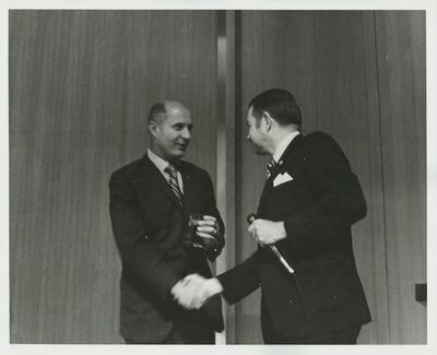 Dr. Clark presents Col. Stafford with a Model of Dr. Goddard's 1926 rocket - the first successful liquid-fuel rocket in the world - in appreciation for his participation in GSFC's award ceremonies.