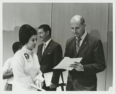 Even the Hostesses came up to get autographs. Here Mrs. Pat Higgs receives hers from Col. Stafford.