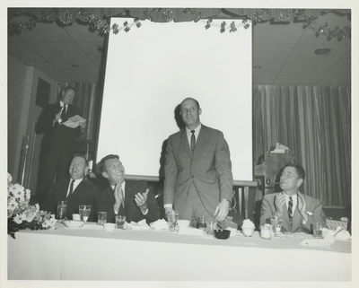 Tom Stafford addresses audience while Jim Lovell and Walter Schirra look on.