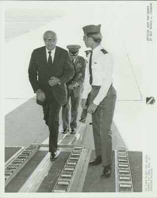 Major Addison Thompson, YC-14 test pilot, (right) shows Secretary of the Air Force John C. Stetson the cargo compartment of the Boeing YC-14. Major General Thomas P. Stafford, Air Force Flight Test Center commander, accompanies the Secretary on board. (U.S. Air Force Photo by Staff Sergeant Dennis Nieuwsma)