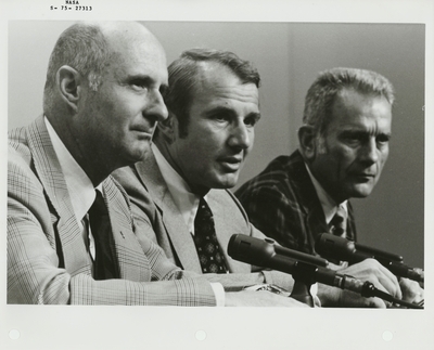 (6 June 1975) --- The three members of the American ASTP prime crew participate in an Apollo-Soyuz Test Project press conference conducted on June 6, 1975. They are, left to right, Thomas P. Stafford, commander; Vance D. Brand, command module pilot; and Donald K. Slayton, docking module pilot. The astronauts also visited the Building 2 briefing room at NASA’s Johnson Space Center where they received a special box of genetically superior white spruce seeds from Glenn A. Kovar, USDA Forest Service project coordinator. The seeds, enough to plant an acre of trees, will be presented to the Soviet ASTP crewmen during the U.S.-USSR Apollo-Soyuz Test Project docking-in-Earth-orbit mission in July 1975.