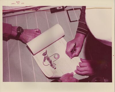 (17 July 1975) --- The hands of cosmonaut Valerly N. Kubasov are seen as the ASTP engineer adds his name to the signature on the Soviet side of the official joint certificate marking an historical moment during the rendezvous day of the Apollo-Soyuz Test Project. The left hand of astronaut Donald K. Slayton, NASA's docking module pilot, is seen at left. The certificate had earlier been signed by astronauts Thomas P. Stafford, American crew commander; Slayton and cosmonaut Aleksey A. Leonov, Soviet crew commander, and it awaits the signature of astronaut Vance D. Brand, NASA's command module pilot who remained in the CM while the others signed in the Soviet Orbital Module of the Soyuz.