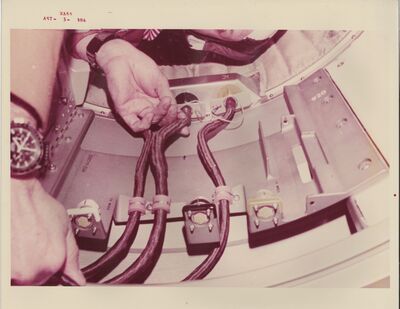 (17-19 July 1975) --- ASTP astronauts examine systems and mechanisms inside the hatchway leading from the Apollo Docking Module (DM) to the Soyuz Orbital Module (OM) during the joint U.S.-USSR Apollo Soyuz Test Project (ASTP).